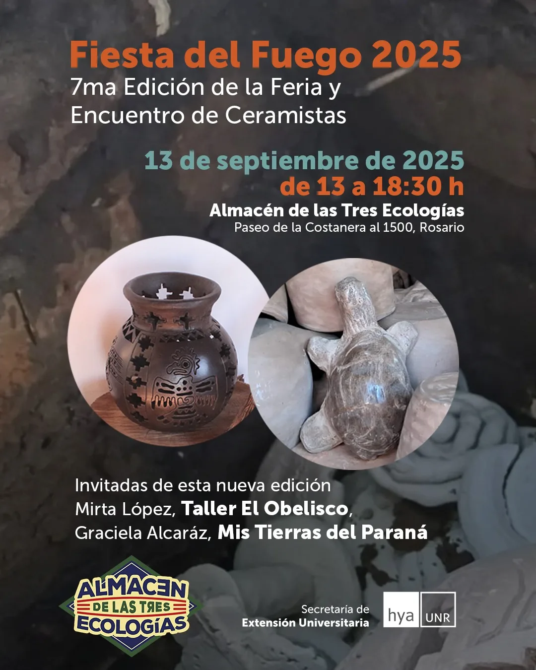 Este sábado 13 de setiembre, a partir de las 13, se llevará a cabo la 7ma. Edición de la Fiesta del Fuego, Feria y Encuentro de Ceramistas, la tradicional cita que convoca a cientos de personas con su atractiva propuesta artesanal. La actividad está organizada por el Almacén de las Tres Ecologías y la Secretaría de Extensión Universitaria de la facultad de Humanidades y Artes (UNR). El espacio donde se llevará a cabo es el Almacén de las Tres Ecologías (Paseo de la Costanera al 1500).