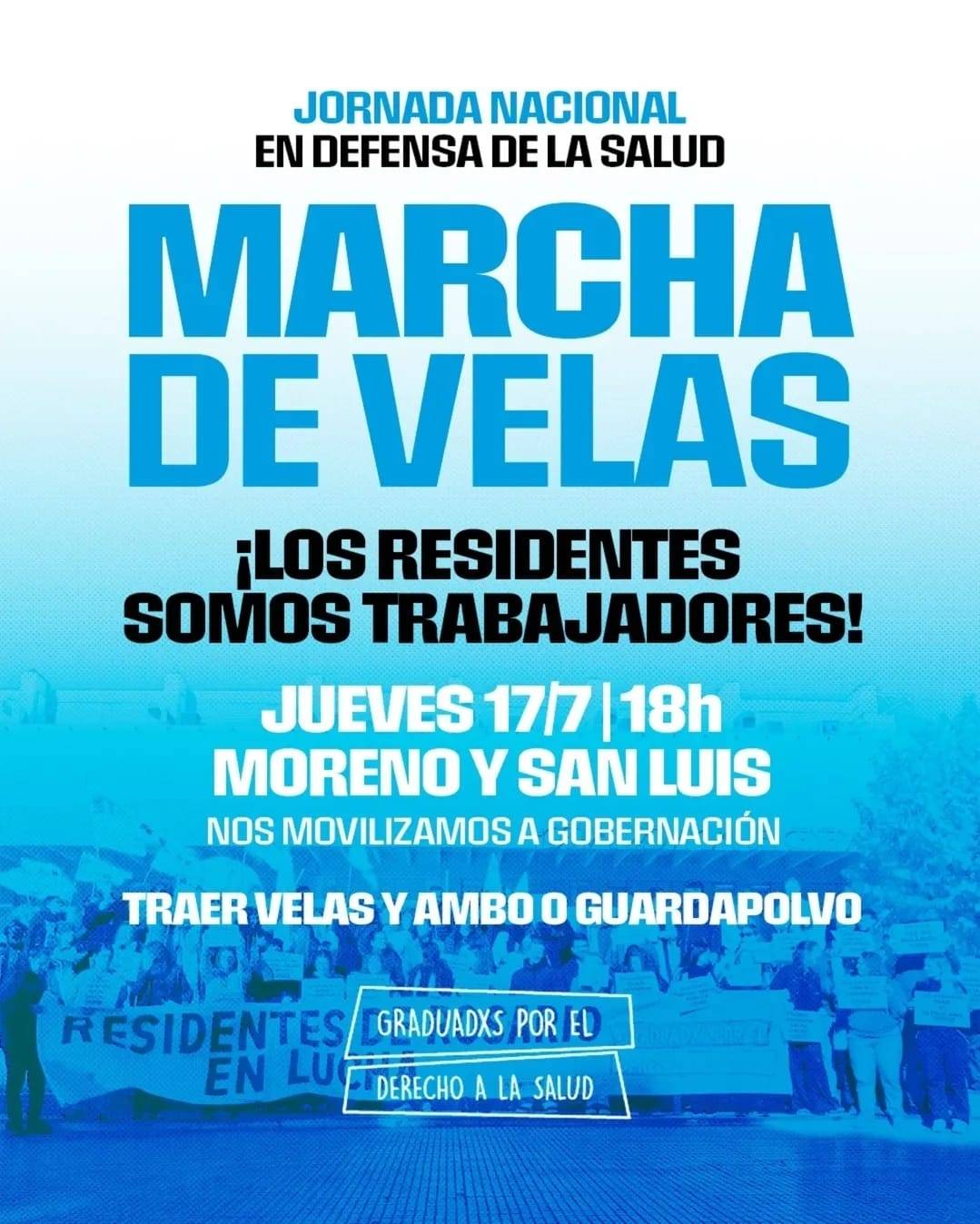 Por otro lado, también se sumará la Marcha de Velas en Moreno y San Luis a las 18, Allí los médicos residentes movilizarán a Plaza San Martín.