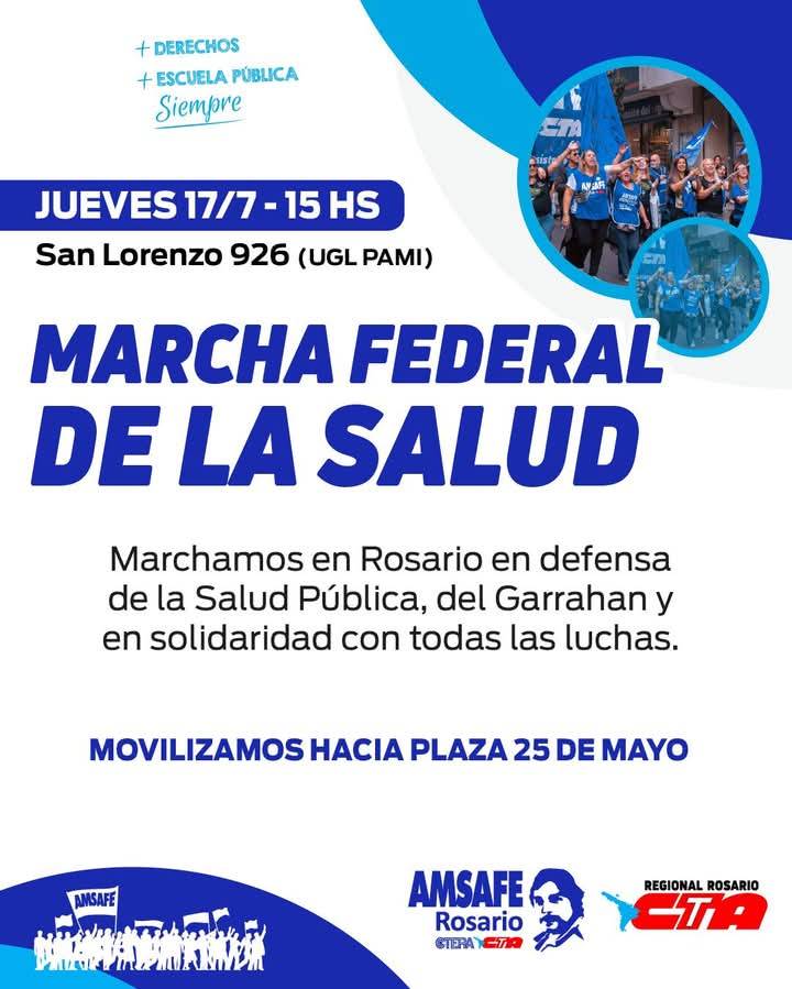 En el marco de una jornada nacional de protesta, la movilización multisectorial partirá a las 15 desde San Lorenzo 926, la sede local del Pami, hacia la plaza 25 de Mayo, de Laprida y Santa Fe. Desde la Asociación de Trabajadores del Estado (ATE) anticiparon que, para acompañar la marcha, habrá un paro en el área salud en todos los niveles (nacional, provincial y municipal), garantizando la atención con guardias mínimas.