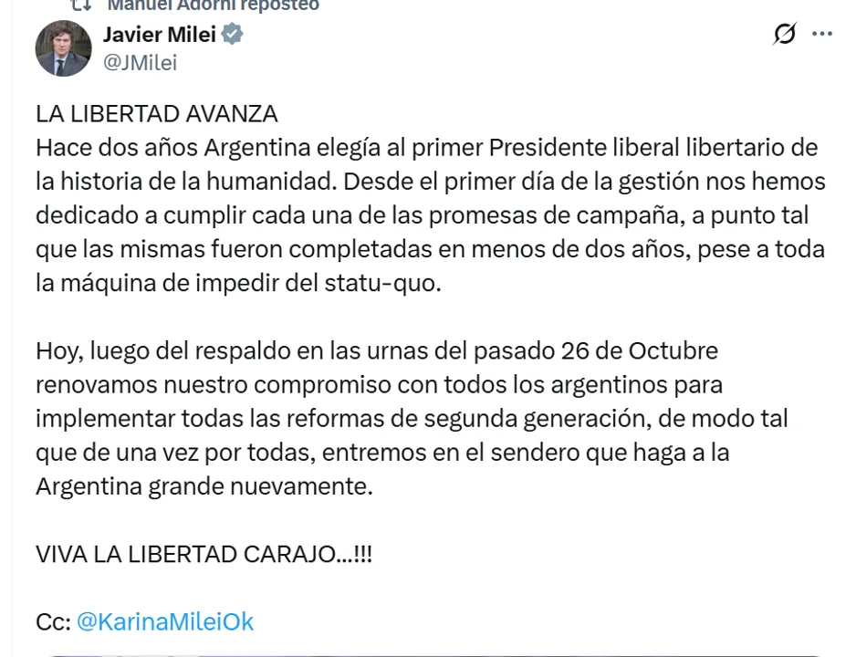 A través de su cuenta de X, y a dos años del acontecimiento, el mandatario expresó: «LA LIBERTAD AVANZA Hace dos años Argentina elegía al primer Presidente liberal libertario de la historia de la humanidad».