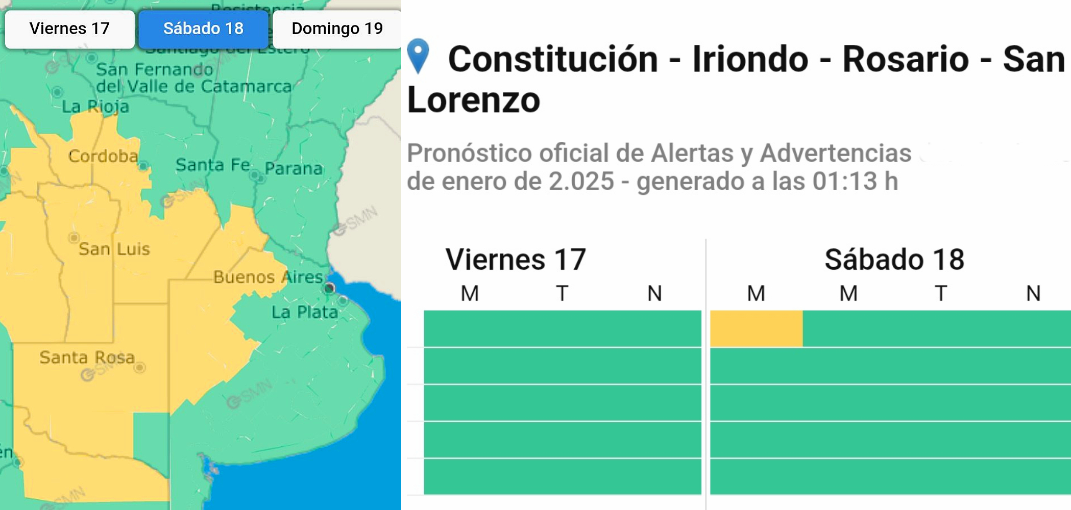 El aviso es para la madrugada de sábado, aunque se extiende para el domingo. Es alta la probabilidad de que sucedan algunas tormentas fuertes con actividad eléctrica, abundante caída de agua en cortos períodos –entre 20 y 40 mm, pudiendo ser superados en forma puntual–, ráfagas superiores a 60 km/h y ocasional caída de granizo.