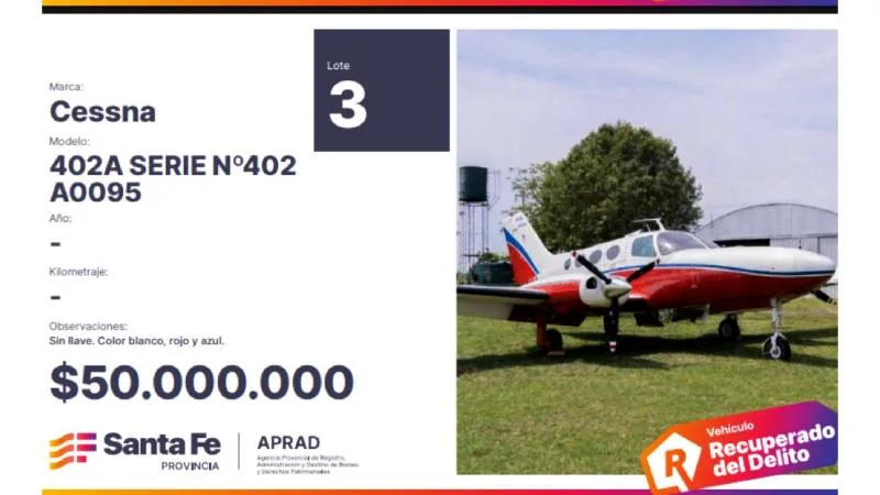 Las inscripciones para participar de la nueva subasta de bienes incautados al delito, que se llevará a cabo en el Salón Metropolitano de Rosario el próximo 16 de abril, abrieron este jueves y ya se dieron a conocer los 150 lotes que serán rematados. Por primera vez en la historia, se rematará un un avión.