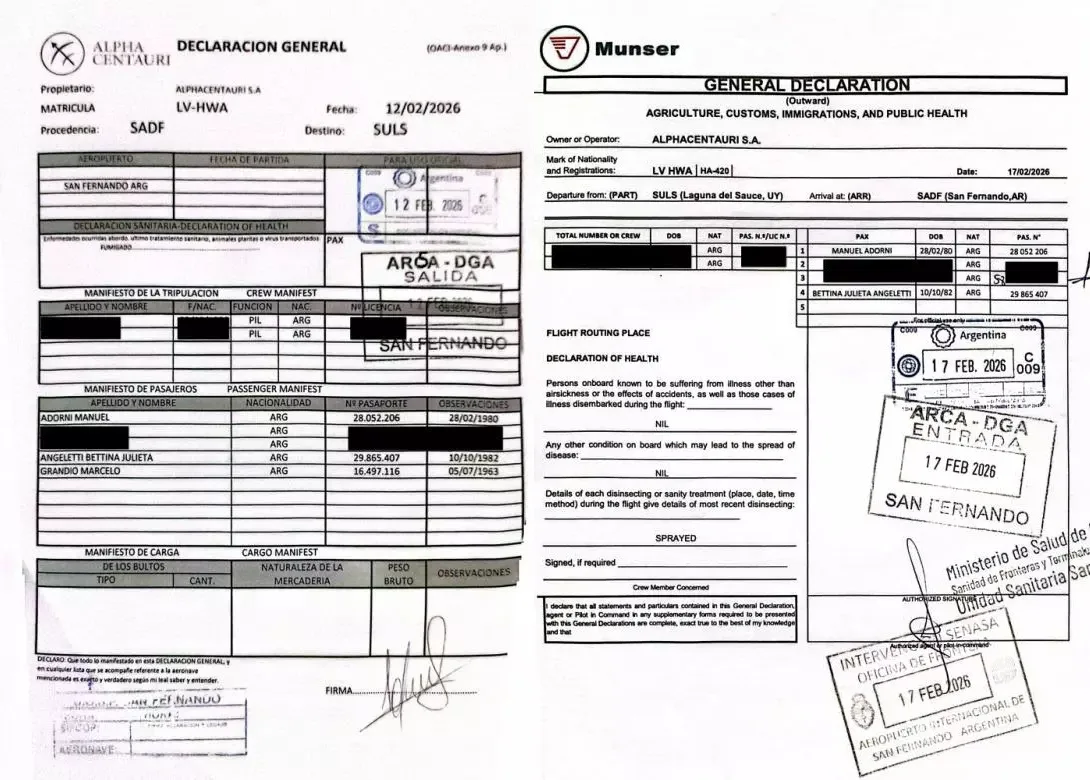 De acuerdo al artículo de Lacunza, que incluye abundante documentación de respaldo, el viaje al exclusivo destino uruguayo fue entre el 12 y el 17 de febrero pasados. Fue en un Honda Jet con matrícula LVHWA contratado al operador Alpha Centauri. En esa aeronave viajaron, además de Adorni y Angeletti, dos familiares de la pareja y, dato relevante, el periodista libertario Marcelo Grandio.