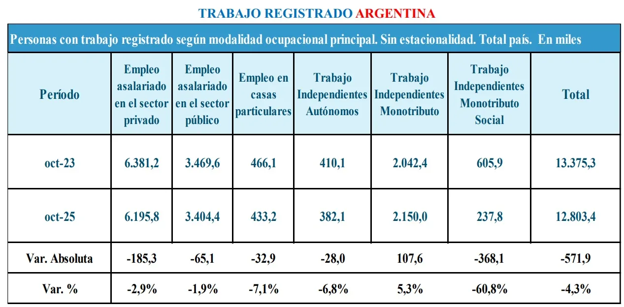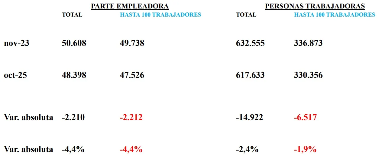 Según el relevamiento, las pymes representan el 97,8% del total de unidades económicas del país y concentran el 76% del empleo privado, datos que exponen la relevancia del sector y que amplifica el impacto de la recesión sobre el mercado laboral. Entre octubre de 2023 y octubre de 2025, el empleo asalariado registrado en el sector privado cayó casi un 3% a nivel nacional, con retrocesos en 10 de las 14 ramas de actividad y en 22 de las 24 provincias. El segmento más golpeado es el de empresas de hasta 49 trabajadores, que acumula 23 meses consecutivos de caída interanual del empleo
