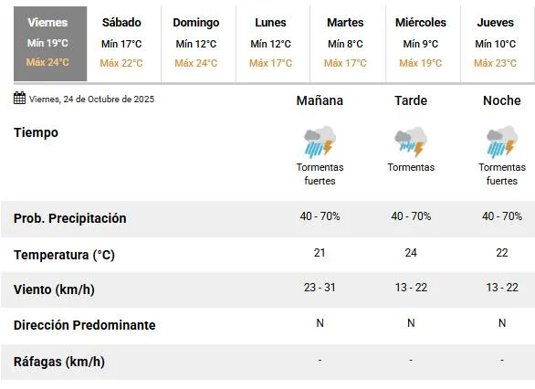 Se prevén fuertes tormentas en la mañana y en la noche. Tormentas por la tarde. Vientos del sector norte durante toda la jornada.