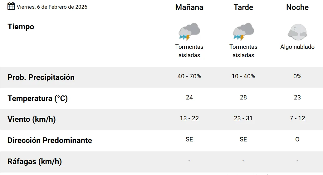 El pronóstico oficial anuncia probabilidad baja de más tormentas aisladas durante la tarde de este viernes, con alivio térmico. La máxima estimada es de 28 grados.