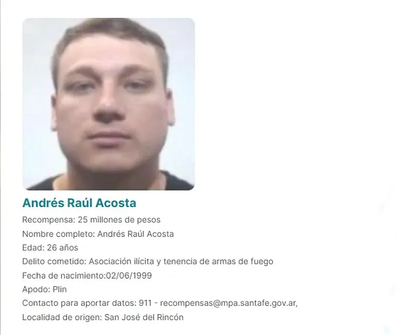 Se trata de Andrés Raúl Acosta, alias “Plin”, cuya fecha de nacimiento fue el 2 de junio de 1999. Para dar con su captura, se fijó una recompensa de $25.000.000. La solicitud la inició el Fiscal de la Unidad Especial de Homicidios Dolosos de Rosario, Dr. Patricio Saldutti, quien ordenó la detención de “Plin” Acosta el 12 de junio de 2025 por encontrarse investigado en la causa caratulada “NN s/Asociación Ilícita y Tenencia de Armas de Fuego (CUIJ Nº 21-09588260-6)”