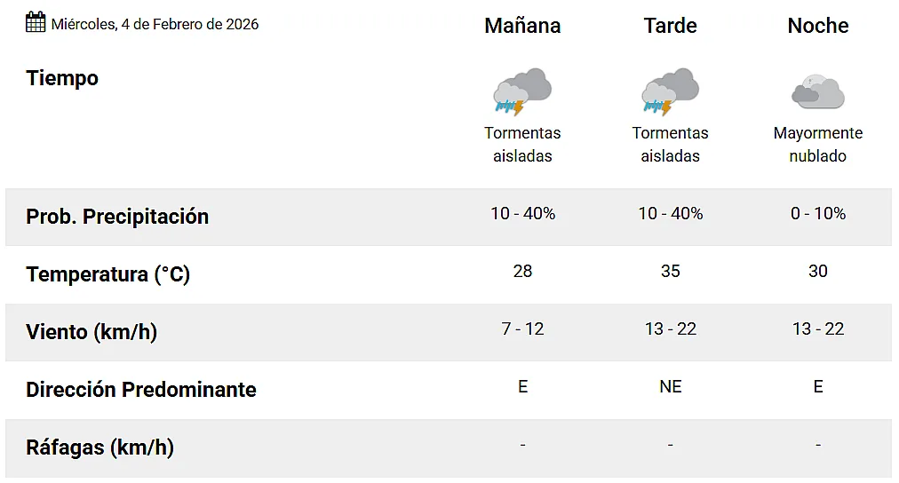 El pronóstico oficial indica probabilidad de lluvias con actividad eléctrica para la mañana y tarde de este miércoles. Sin embargo, el agua no estará acompañada de alivio: la máxima estimada es de 35 grados. Los vientos soplarán del Este y Noreste.
