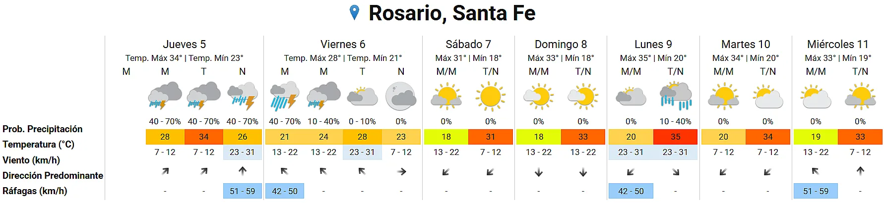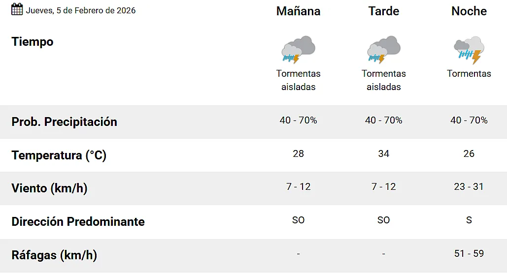 El pronóstico oficial adelanta probabilidad de hasta un 70% de tormentas durante todo este jueves. La máxima estimada es de 34 grados, con vientos del Suroeste y Sur, particularmente intensos hacia la noche.