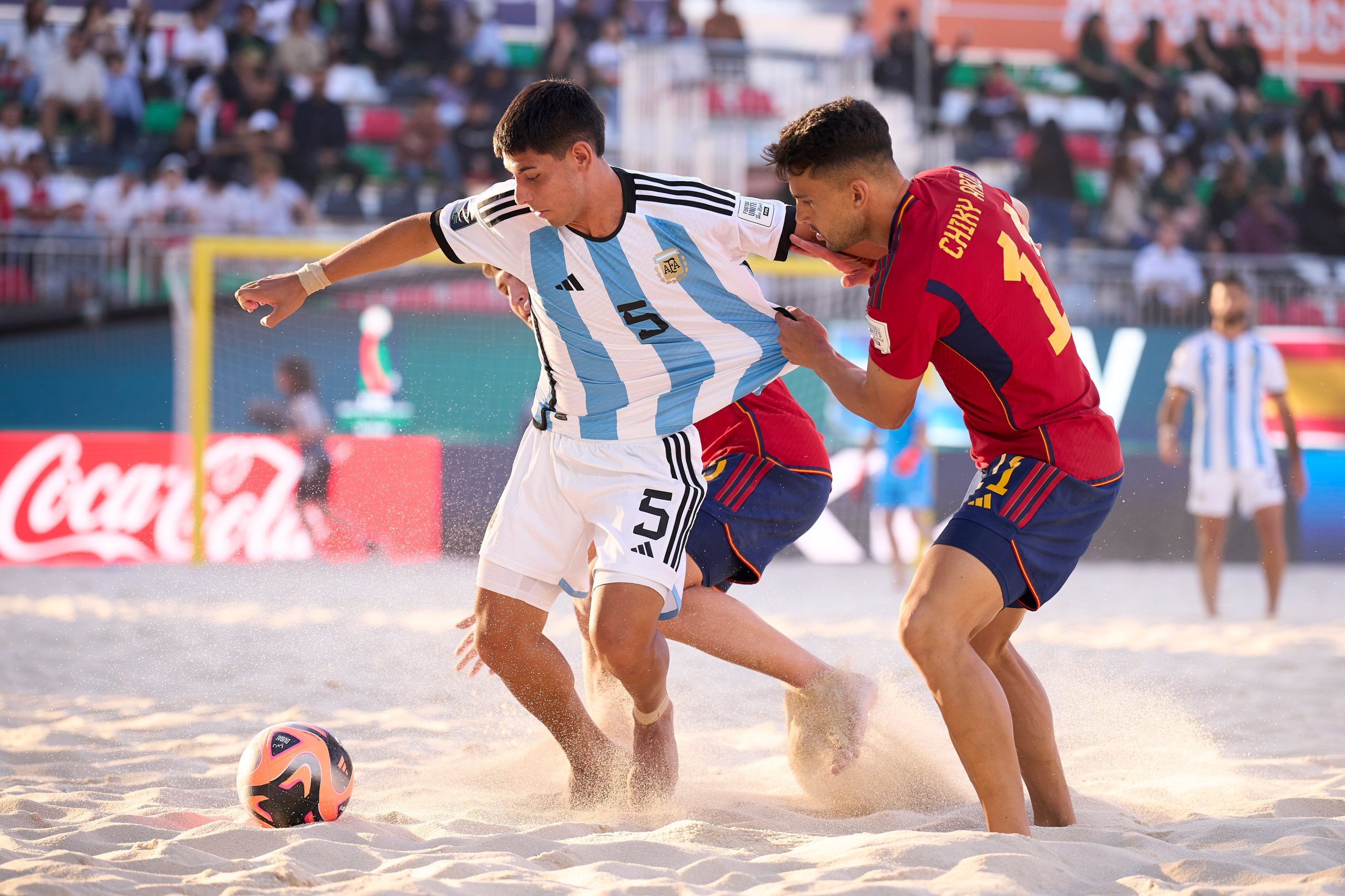 Derrotados ambos conjuntos en las jornadas previas por Tahití e Irán y eliminados de antemano, el choque se decidió a favor del equipo albiceleste gracias a dos disparos lejanos en el último periodo que sorprendieron al guardameta español con ayuda de piques favorables en la arena.