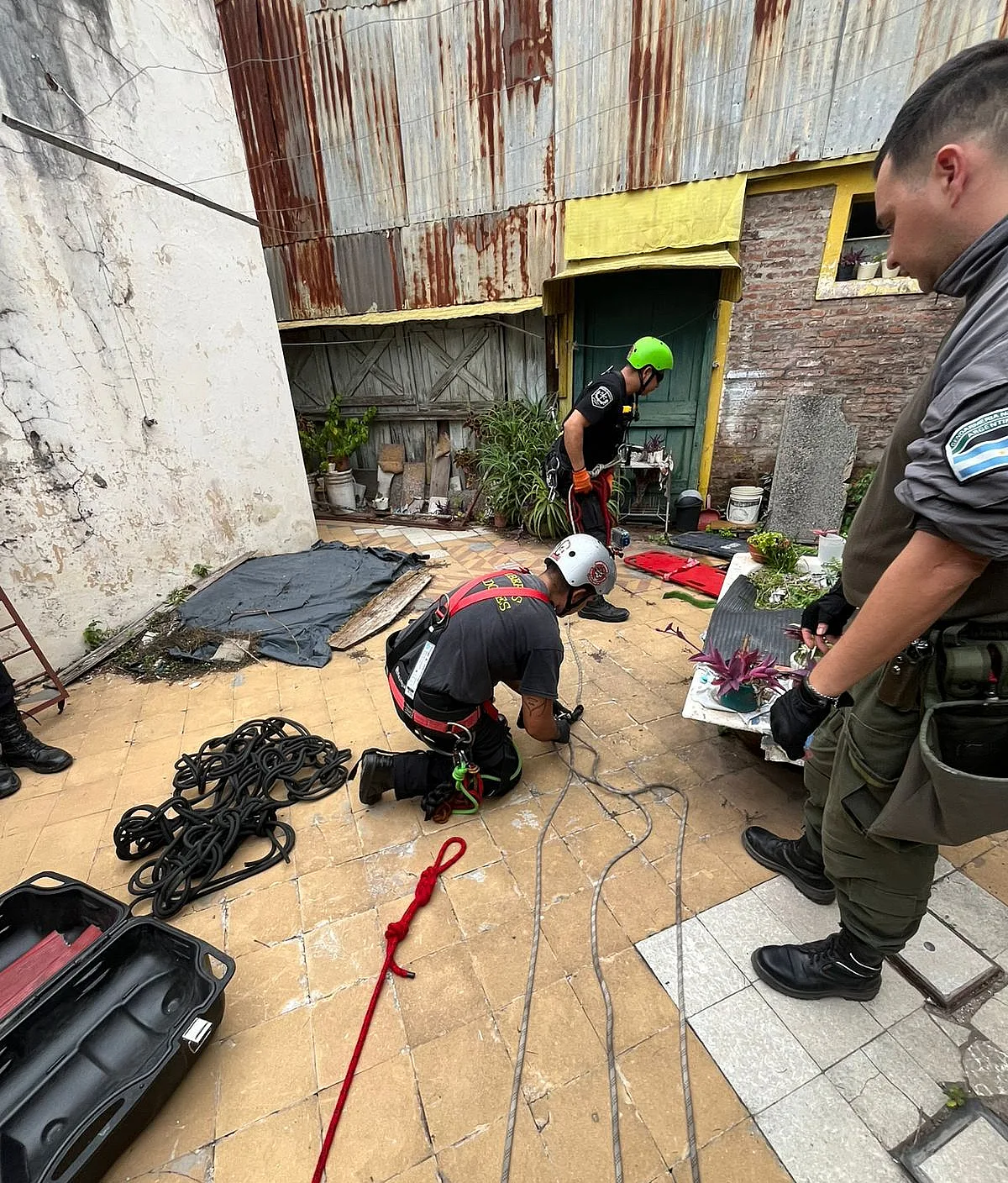 La mujer cayó al pozo pasadas las 16. Las tareas de rescate insumieron casi dos horas. Un bombero descendió con cuerdas al hueco para brindarle primeros auxilios, mientras sus compañeros preparaban el dispositivo para izarla hasta la superficie.