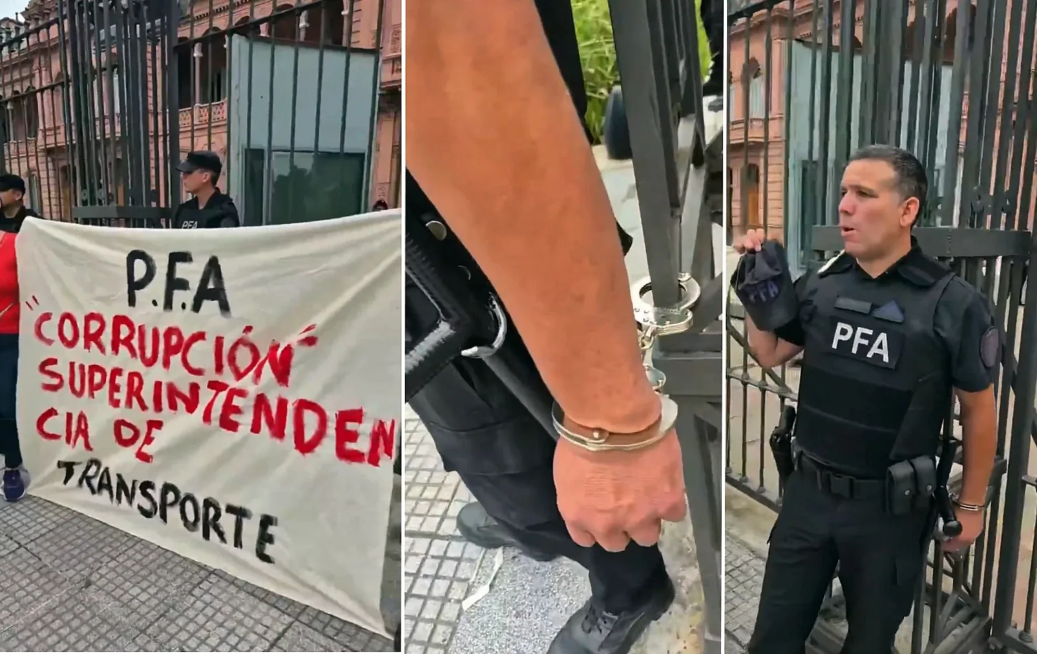 Un efectivo de la Policía Federal Argentina se presentó uniformado y portando su arma en el frente de Balcarce 50 para protagonizar una singular protesta y denuncia. Alrededor de las 10.40, el cabo Miguel Ángel Montiel se esposó a la reja perimetral de Casa Rosada y, rodeado por otros dos uniformados, desplegó una pancarta con el mensaje: «P.F.A. Corrupción. Superintendencia de Transporte».