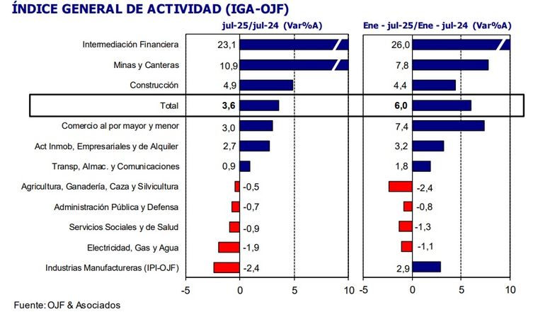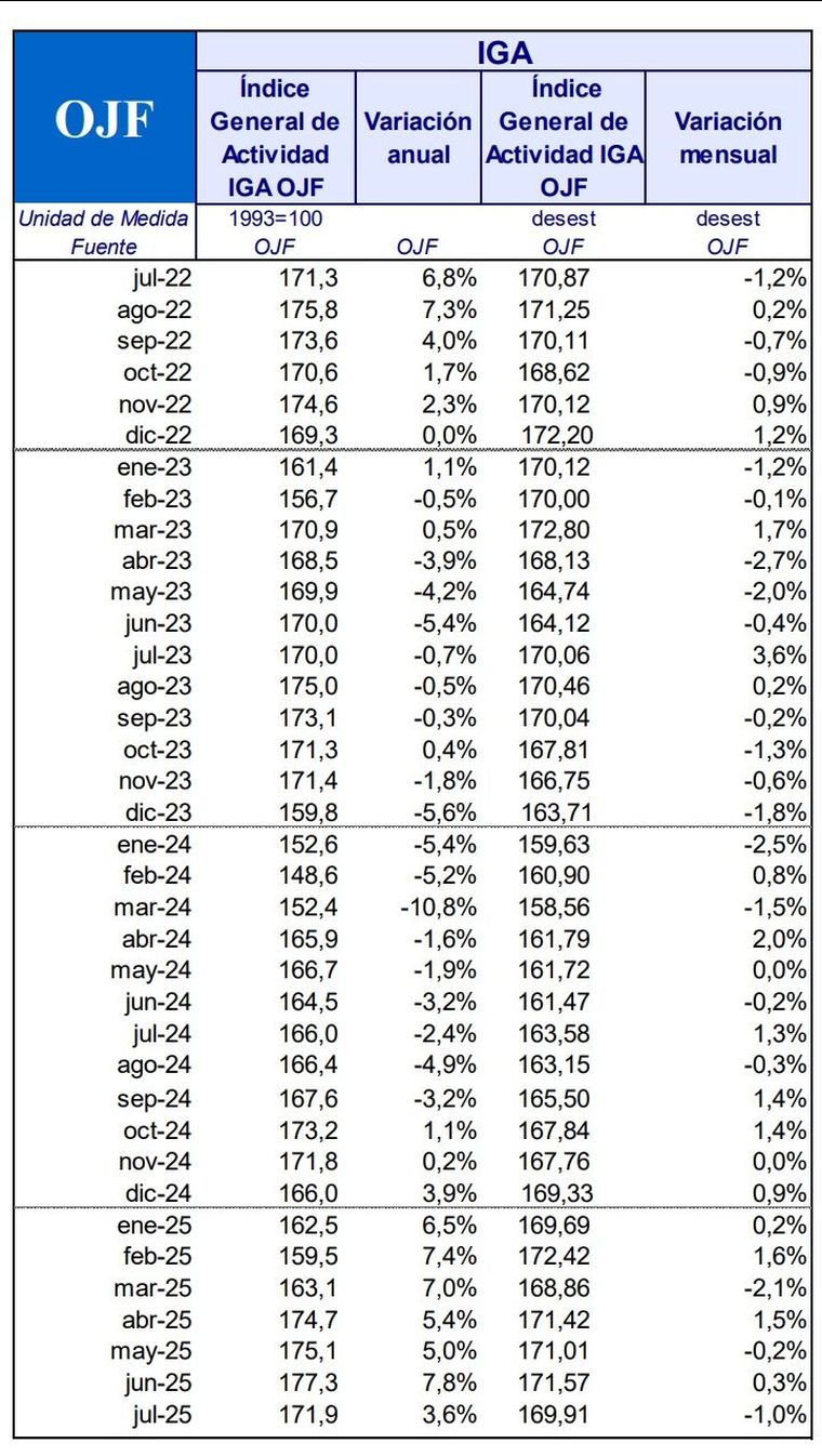 La economía argentina desaceleró en el mes de julio. A pesar de mantener un crecimiento interanual del 3,6%, según el Índice General de Actividad (IGA-OJF) de la consultora de Orlando Ferreres, el nivel de actividad económica general mostró en la medición desestacionalizada una contracción del 1% en comparación con junio.