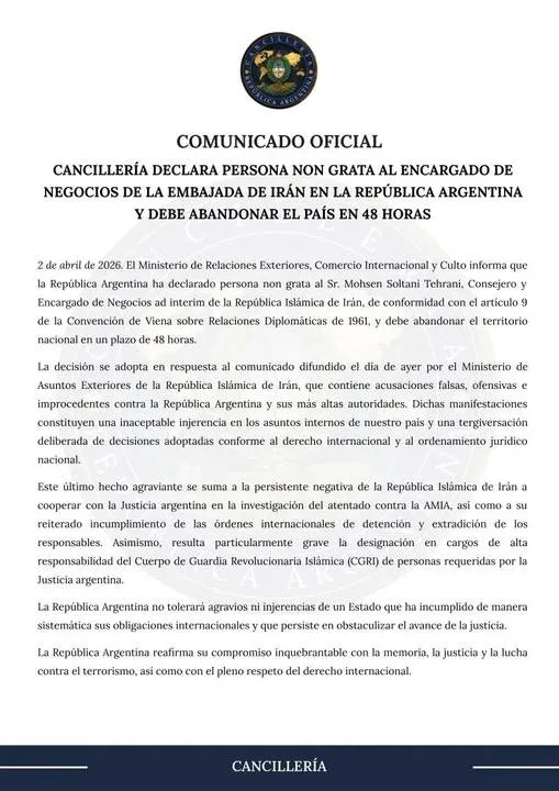 La Cancillería Argentina instó al encargado de negocios de Irán a abandonar al país en 48 horas, tras declararlo persona no grata, tal como lo afirmó el comunicado publicado por la cartera liderada por Pablo Quirno.