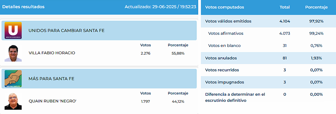El vencedor en las primarias fue el actual intendente, el peronista Rubén «Negro» Quain. Su retador quedó entonces 80 votos abajo del jefe del Ejecutivo. En las generales de este domingo, y promesa de regalos mediante, revirtió posiciones y le ganó al postulante para la reelección en Más para Santa Fe por 479 votos de diferencia.