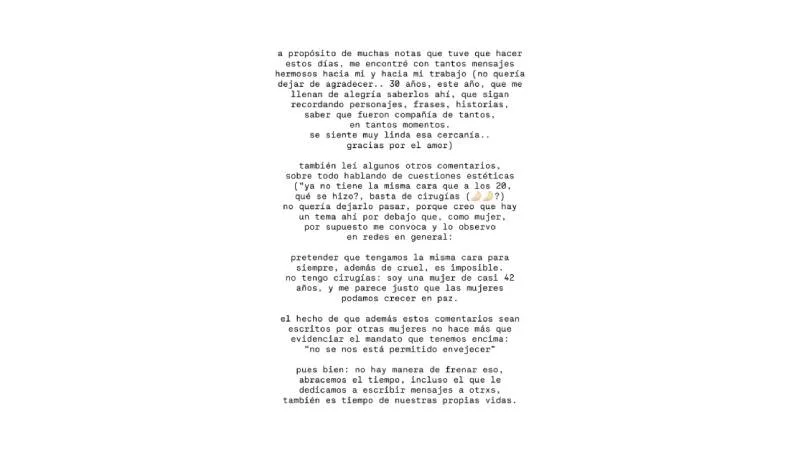 Pero agregó: «Y leí otros comentarios, sobre todo aquellos que hablaban de cuestiones estéticas (‘ya no tiene la misma cara que a los 20′, ‘¿qué se hizo?’, ‘basta de cirugías’). No quise dejarlo pasar, porque creo que hay un tema de fondo que, como mujer, por supuesto me convoca y que observó en las redes en general. Pretender que tengamos la misma cara para siempre, además de ser cruel, es imposible. No tengo cirugías: soy una mujer de casi 42 años, y me parece justo que las mujeres podamos crecer en paz”.