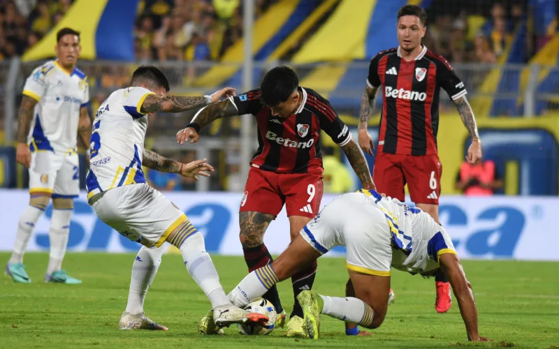 River tuvo sus cinco minutos de furia entre los 30 y 35, pero fueron todos remates de afuera que llevaron peligro. El primero de Colidio que Ledesma mandó bien al córner tras un pique complicado antes, el segundo un disparo de Rivero, que se fue cerca del palo derecho, y el tercero un bombazo de Juanfer Quintero que el 1 canalla mandó por arriba del travesaño.