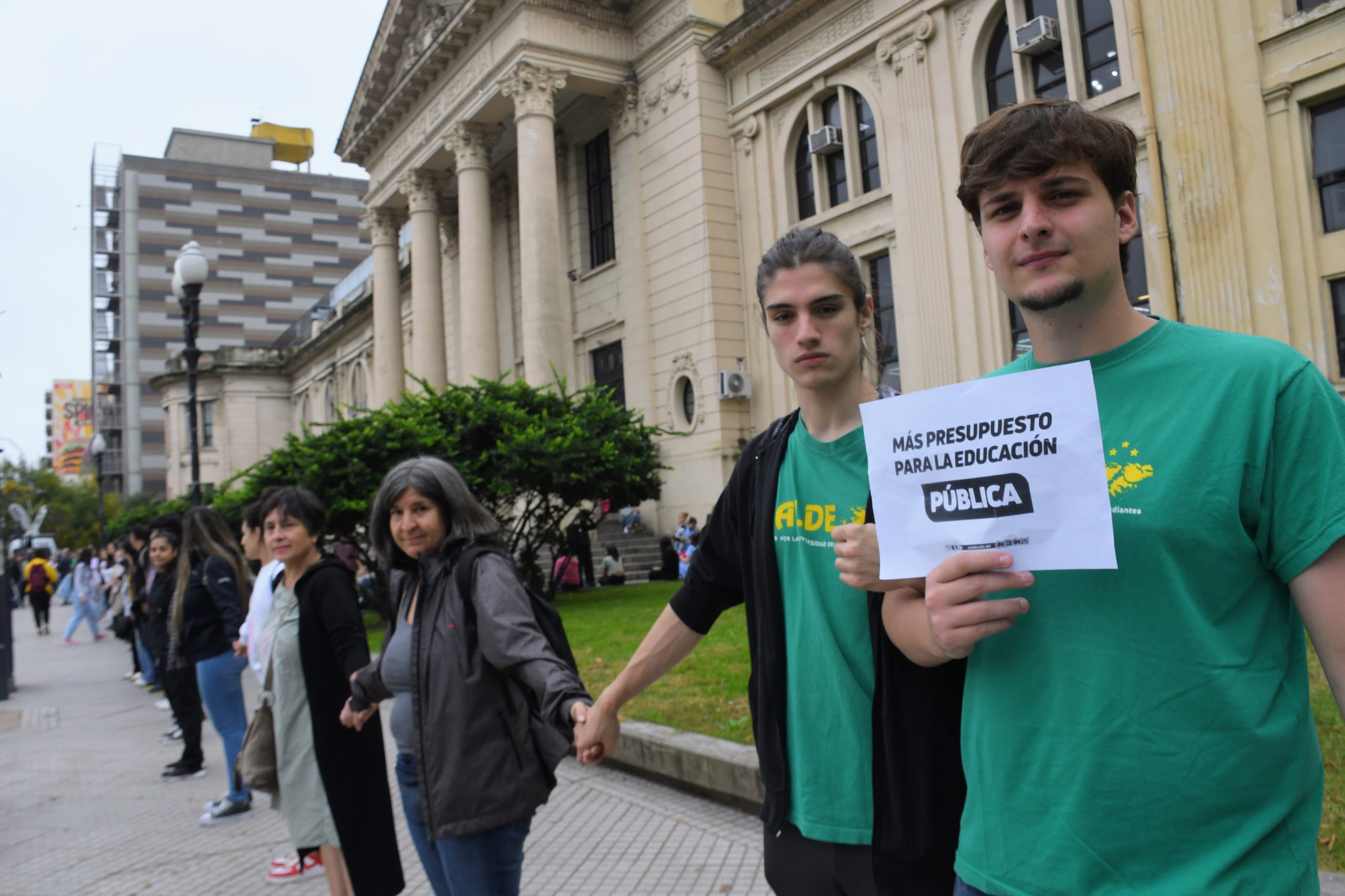 Impulsado por el Centro de Estudiantes de la Facultad de Ciencias Médicas se realizó este lunes una jornada de clases públicas junto a un abrazo a la Facultad al mediodía, con el objetivo de defender la Educación Pública y reclamar más Presupuesto para la Educación en el marco de la Marcha Federal Universitaria.