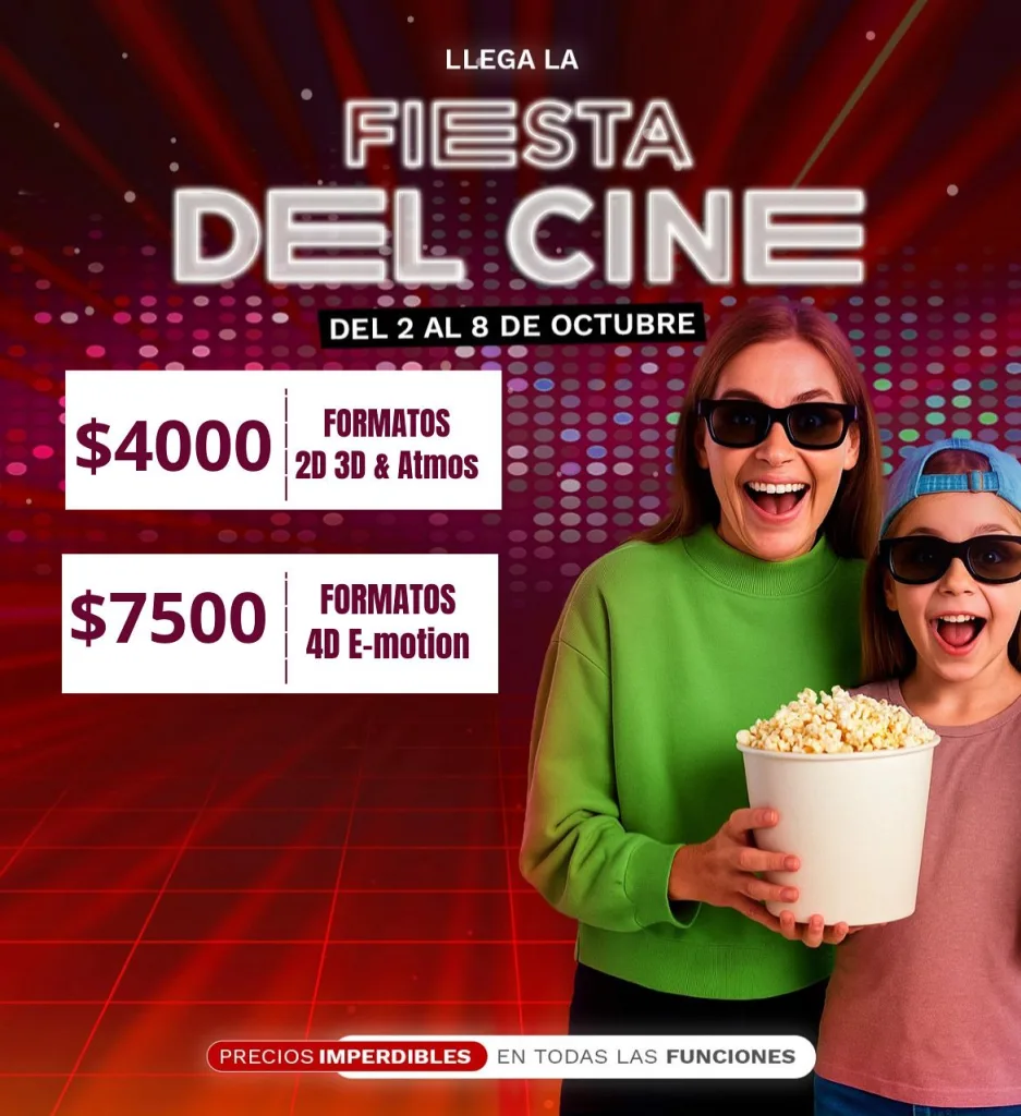 Del 2 al 8 de octubre, los cines del país ofrecerán funciones a 4 mil pesos en el marco de la nueva Fiesta del Cine, para así acercar al público a las películas recientemente estrenadas, además de algunos reestrenos. Los complejos Showcase, Hoyts, Las Tipas, Cinépolis, Monumental y Del Centro son los que están adheridos a esta fiesta.