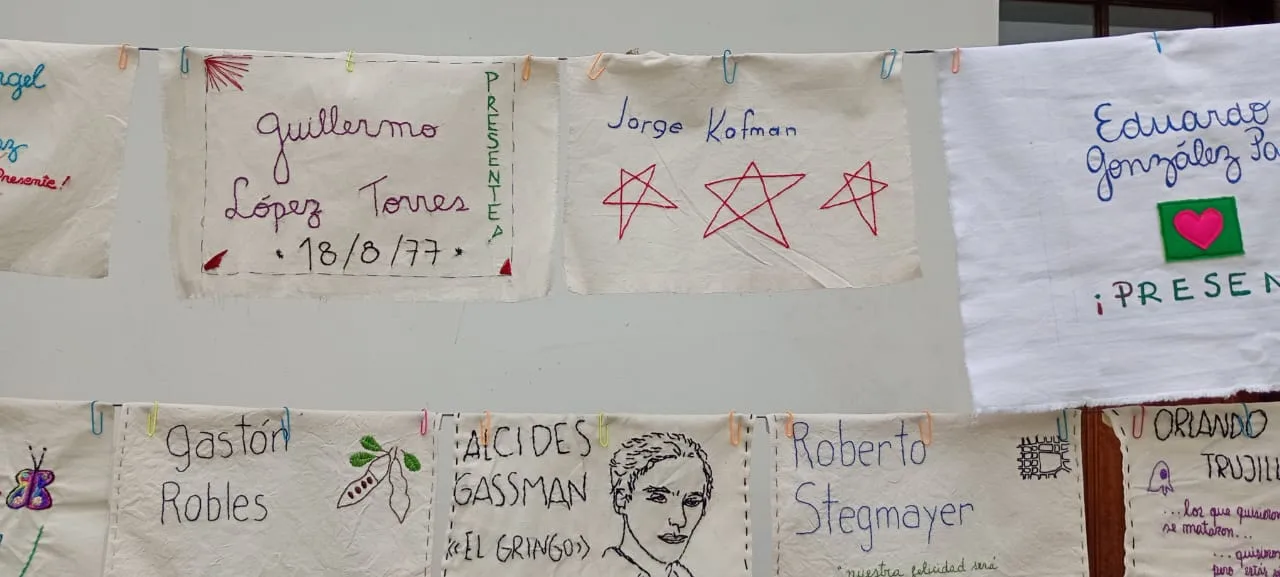 “Alguien supo que, por ejemplo, que Carlos Tenuta, trabajador bancario detenido-desaparecido desde 1978, era peronista y de Colón. Entonces se cosió el escudo de Colón y un ‘Colón y Perón’ junto a su nombre. Una de las compañeras cosió un sol porque la hija contaba que cada vez que su papá aparecía, se iluminaba el lugar donde estaban”, detalla la periodista y militante Mariana Steckler.