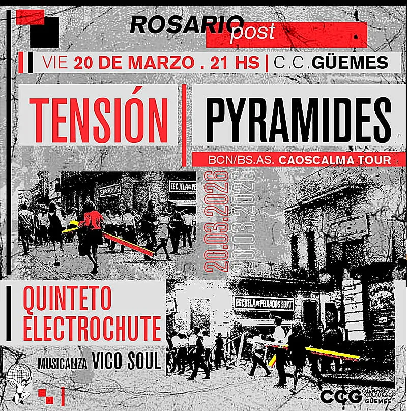Se viene una noche de sonidos oscuros, ritmos frenéticos y una identidad estética marcada por el pulso de los tiempos actuales. El próximo viernes 20, desde las 21, el Centro Cultural Güemes (Ovidio Lagos y Güemes), abrirá sus puertas a Tensión, Pyramides y Quinteto Electrochute. Esta propuesta busca sumergir al público en una atmósfera magnética influenciada por el post-punk y la new wave, géneros que hoy cobran una nueva relevancia gracias a grupos que logran dialogar con la tradición sin renunciar a una voz propia. Las entradas están disponibles en Entradaplay.com