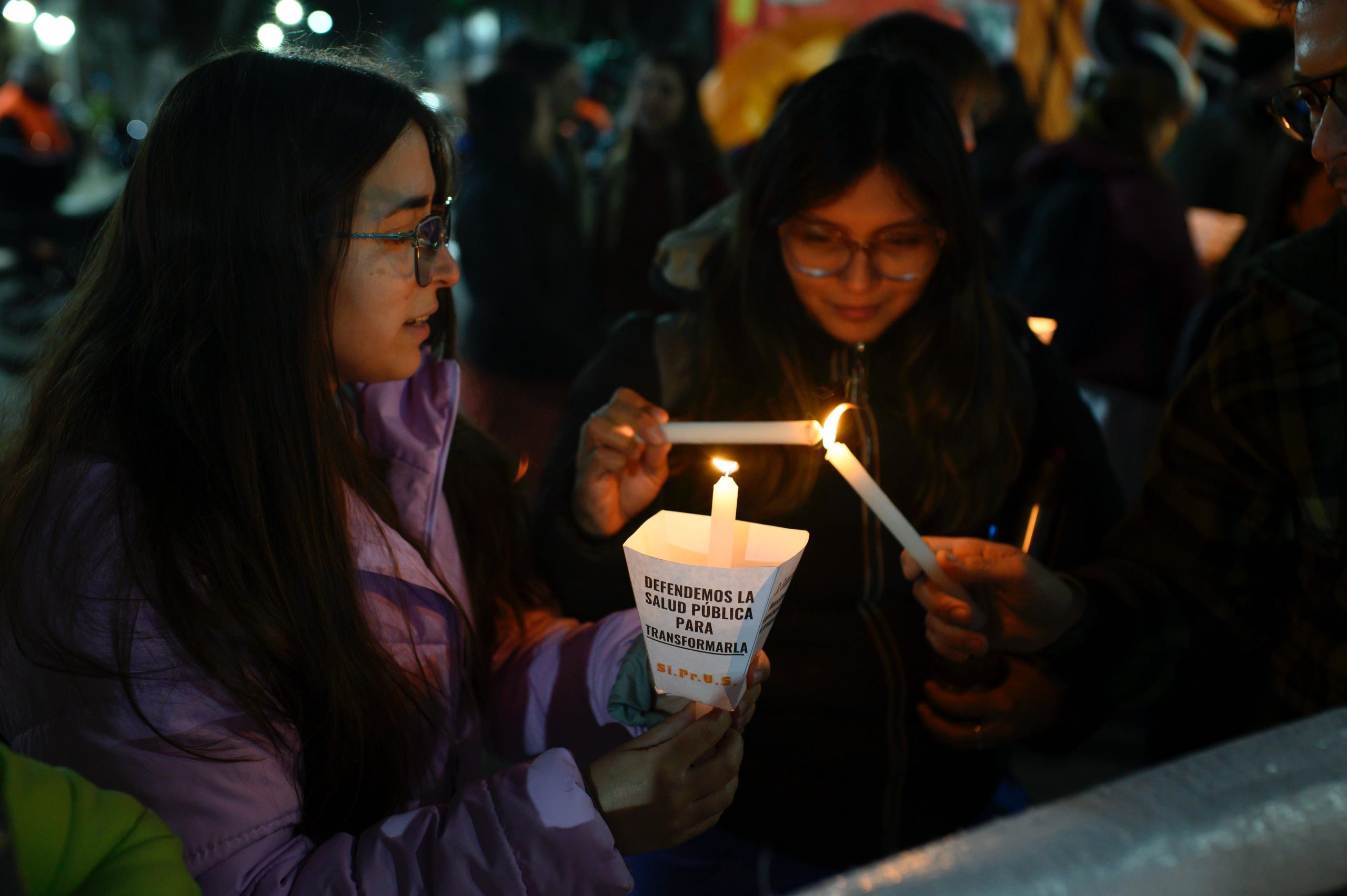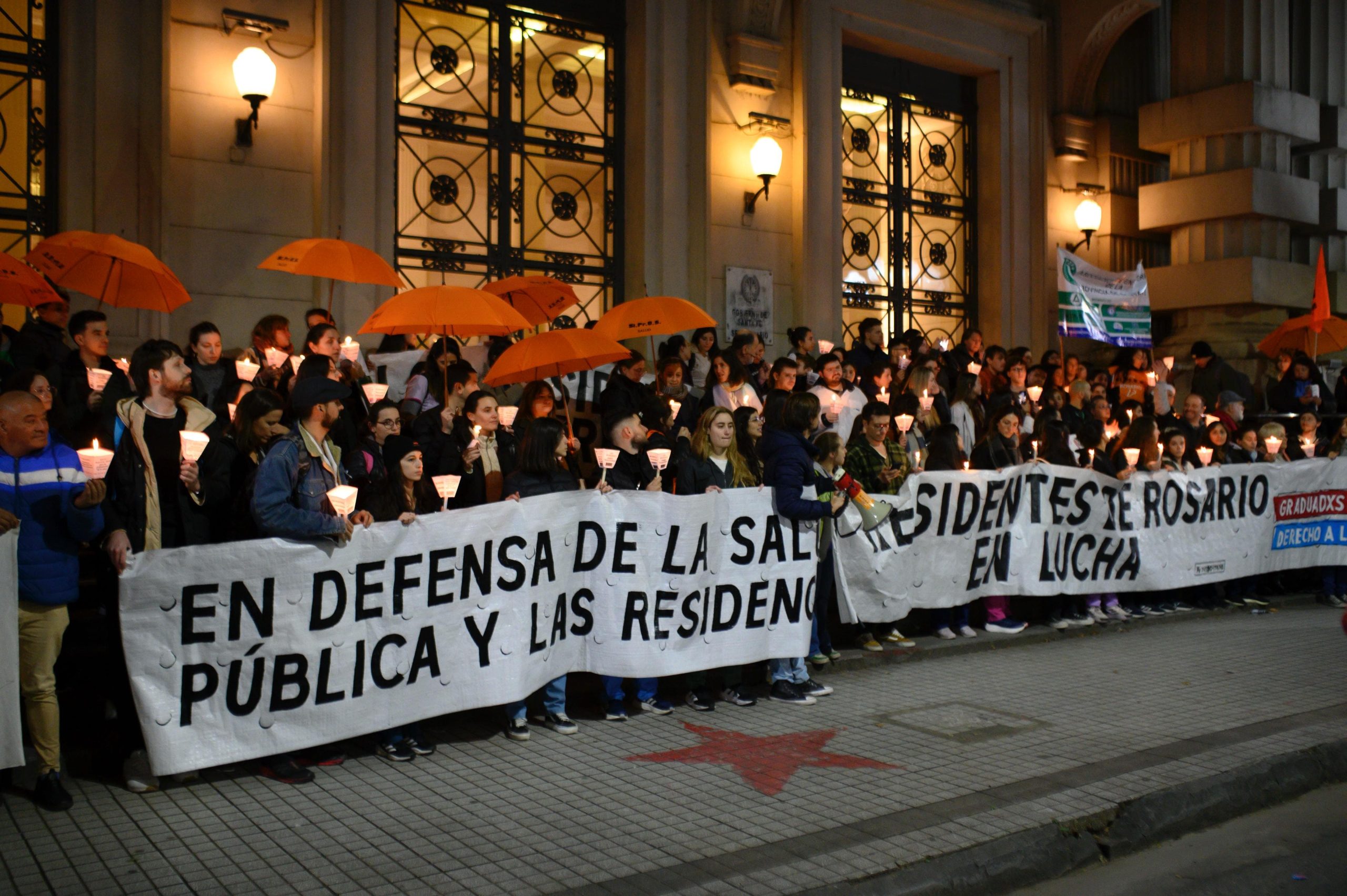 Con carteles «en defensa de la salud pública y las residencias», y «residentes de Rosario en lucha», los manifestantes llegaron a las escalinatas del edificio de Santa Fe y Moreno, donde encendieron las velas que identificaron la protesta.