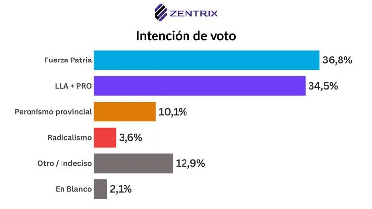 El escenario refleja una polarización competitiva entre Fuerza Patria (36,8%) y la coalición entre La Libertad Avanza+PRO (34,5%), donde la definición dependerá de la movilización electoral y del voto táctico. El Peronismo provincial (10,1%) funciona como espacio de peso intermedio, con capacidad de transferir apoyos según coyuntura y desempeño local. El Radicalismo (3,6%) exhibe debilidad estructural y riesgo de fuga hacia LLA+PRO en un contexto de voto útil. El segmento indeciso/otros (12,9%) constituye el principal foco de volatilidad, y su orientación final será determinante para consolidar mayorías. El voto en blanco (2,1%), aunque acotado, señala un nivel de desafección que podría incrementarse en ausencia de ofertas atractivas.