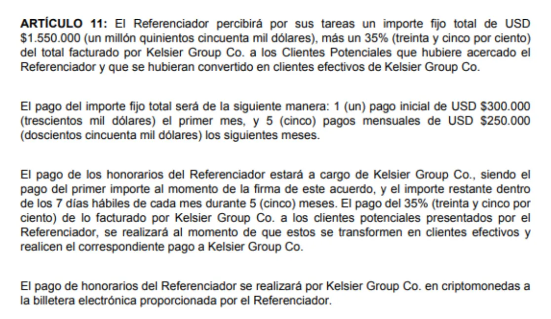 El documento es un archivo en formato Word, denominado “LOI_KELSIER.docx”1 que el trader Mauricio Novelli se envió a sí mismo por WhatsApp el 29 de enero de 2025 a las 18:07:27 y que luego eliminó. Esto ocurrió en la víspera del encuentro en la Casa Rosada entre Javier Milei y el criptoempresario Hayden Davis, que quedó registrada en una selfie de ambos.