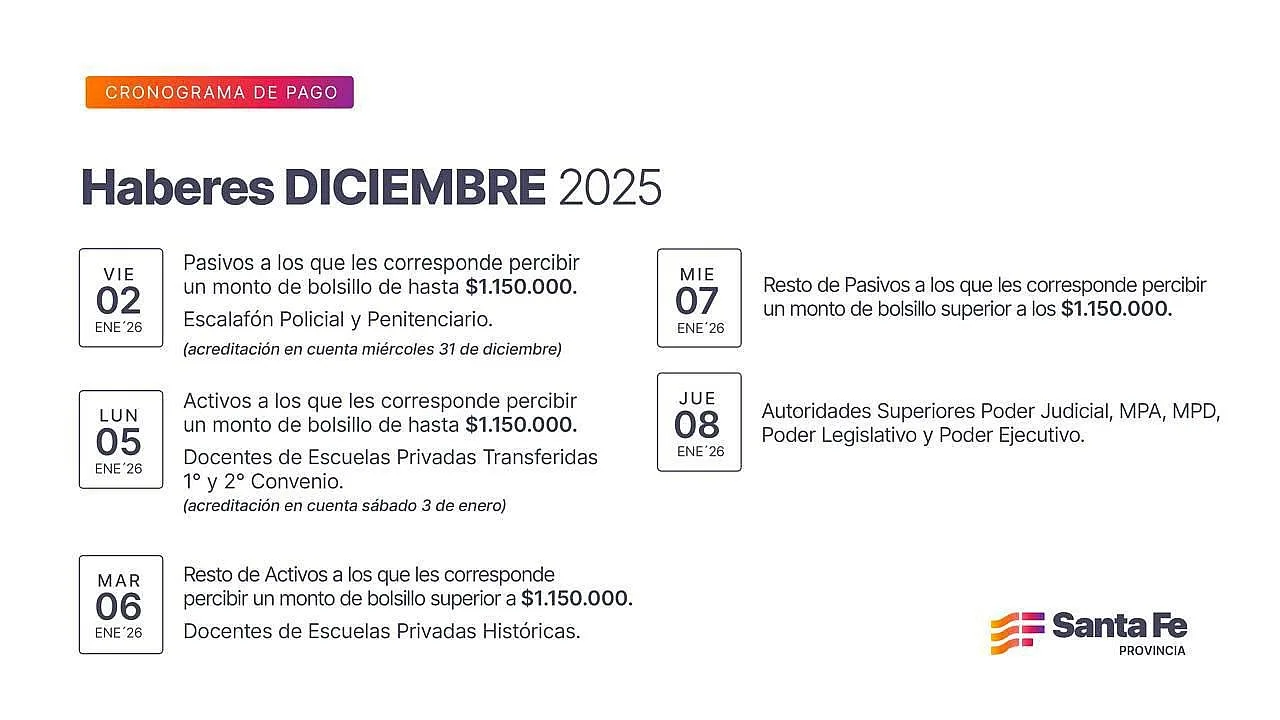El ministerio de Economía de Santa Fe difundió el cronograma de pago de sueldos de diciembre a empleados públicos de la provincia. Coemenzará a depositar los haberes este viernes 2 de enero, con una secuencia que se completará el jueves 8.