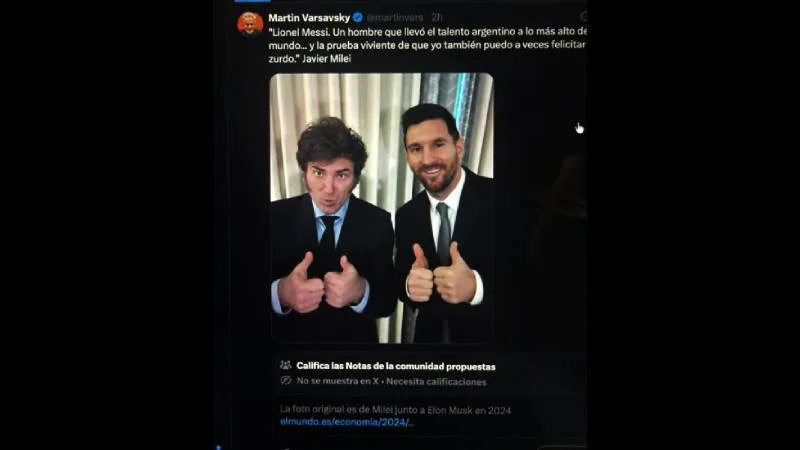 El empresario Martin Varsavsky publicó una foto de Milei y Messi. Era un fake: el original es con Elon Musk. “Community Notes” lo corrigió.