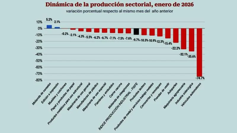 En enero de 2026 la industria siderúrgica (-3,19 p.p.), maquinaria agropecuaria (-1,65 p.p.), vehículos automotores (-1,56 p.p.), molienda de oleaginosas (-1,54 p.p.), autopartes (-0,80 p.p.) y productos lácteos (-0,66 p.p.) fueron las actividades de mayor contribución negativa a la variación interanual del índice de producción industrial de FISFE.