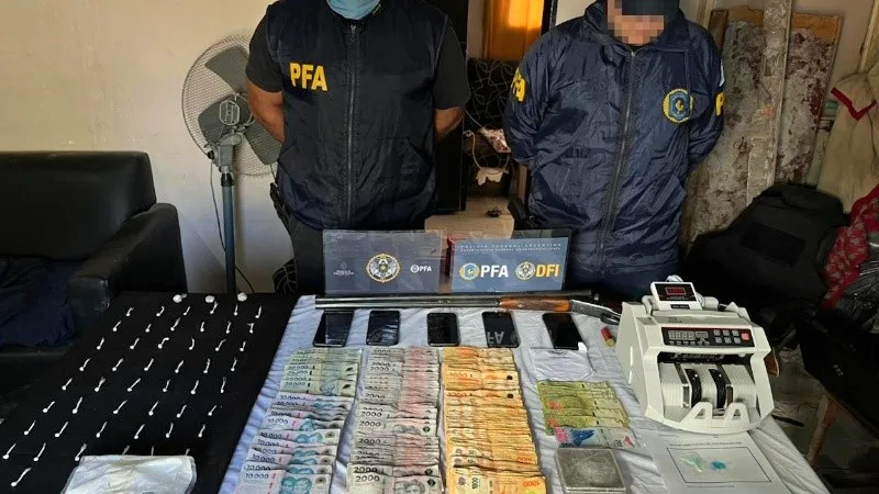 También incautaron clorhidrato de cocaína fraccionado en 50 dosis y listo para su comercialización, dinero en efectivo, una maquina de contar billetes, balanza de precisión, siete celulares y un vehículo.