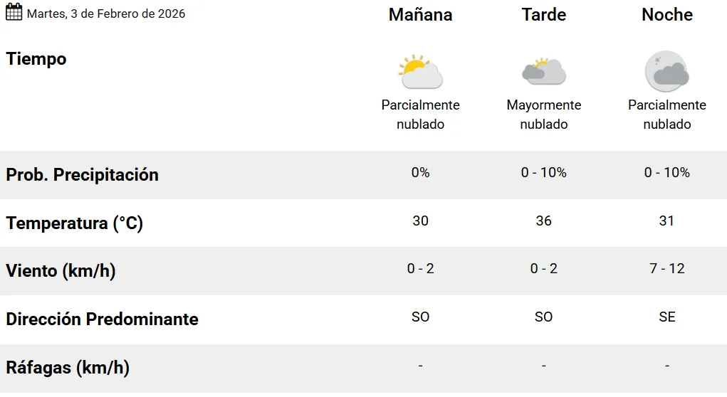 El pronóstico oficial anuncia un martes tórrido con 36 grados de máxima, incluso pese a un cielo de a ratos nublado. Los vientos, leves, soplarán del Suroeste y luego del Sureste.