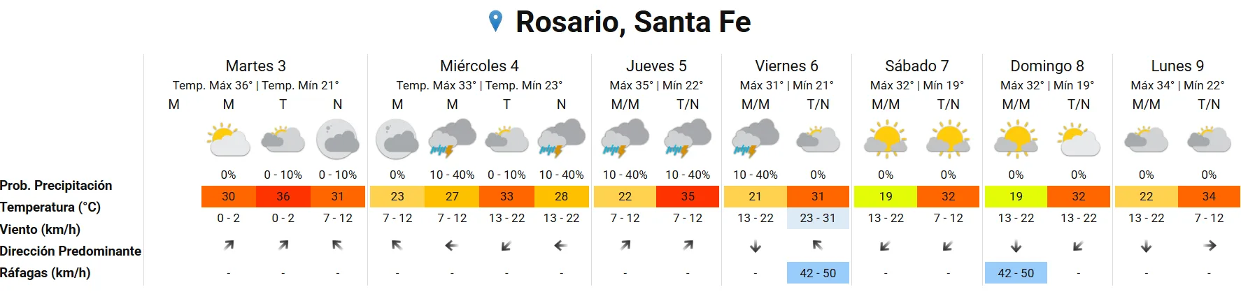 Para el miércoles, el SMN prevé posibles lluvias con actividad eléctrica durante la mañana y por la noche. Sin embargo, será con escaso alivio térmico: estima que el termómetro alcanzará los 33 grados. Los vientos soplarán del Este, Sureste y Noreste.