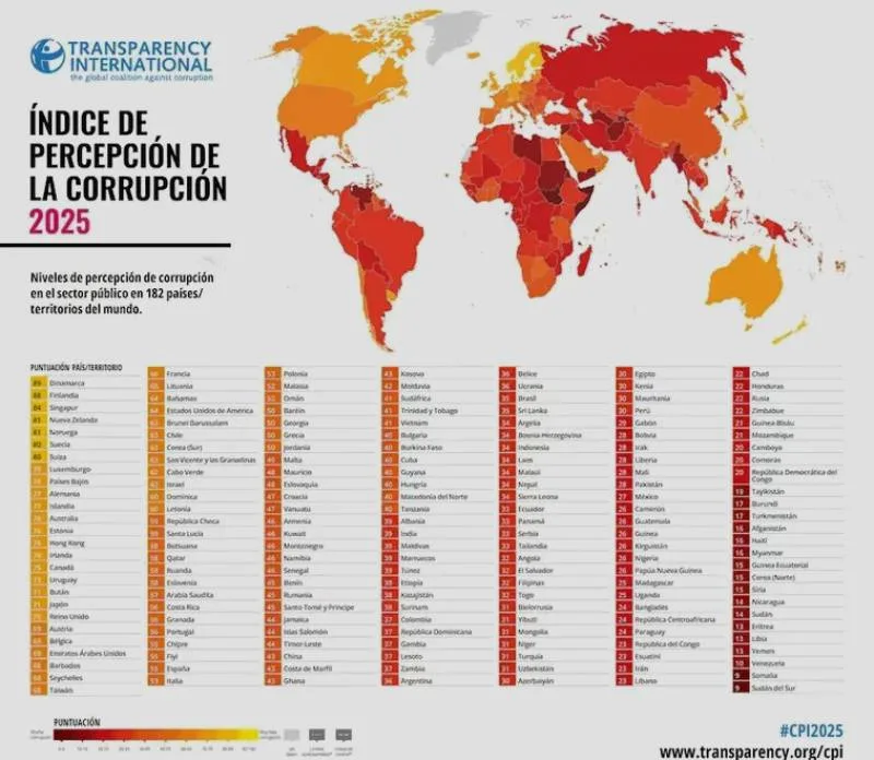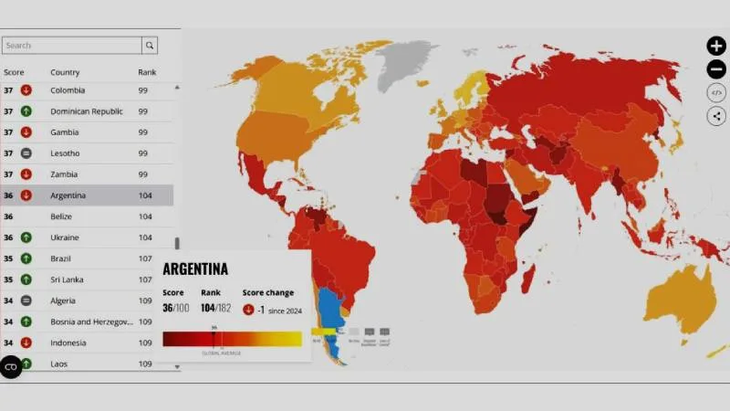 En la clasificación que mide la transparencia y la corrupción en el sector público, la Argentina descendió del puesto 99 al 104, según el último relevamiento de Transparency International correspondiente a 2025. Con una puntuación de 36 sobre 100, el país quedó por debajo de naciones como Lesoto, Gambia y República Dominicana, y comparte posición con Ucrania y Belice en un universo de 182 países evaluados.