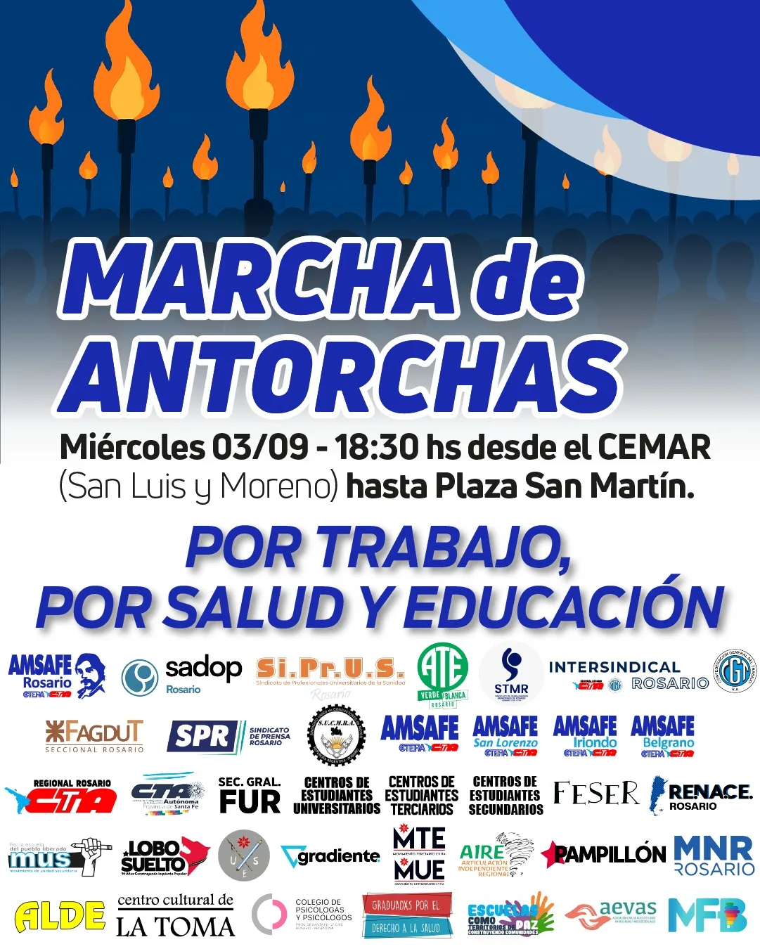 Amsafé Rosario, Sadop Rosario y Siprus realizarán este miércoles, desde las 18.30, la marcha de las antorchas. La concentración será en la esquina del Cemar en Moreno y San Luis y tendrá como destino final la plaza San Martín y será en defensa del trabajo, la salud y la educación pública y en rechazo al ajuste implementado por el Gobierno provincial.