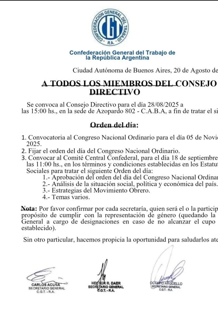 Según el escrito, que lleva la firma del triunvirato, Héctor Daer, Carlos Acuña y Octavio Arguello, el cónclave será a las 15 horas en la sede de Azopardo.