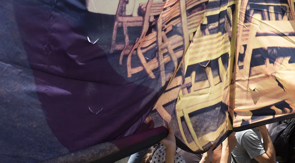 Finalmente, en diálogo con estas prácticas y ejercicios de memoria, el colectivo Trabajadores del Arte (Rosario) expone una serie de piezas (pancartas, banderas, registros fotográficos y fílmicos, textos y otros materiales) producidas para acompañar diversas manifestaciones y movilizaciones públicas acontecidas en el país desde 2016.