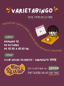 El Revés de la Taba presenta Varietabingo este domingo 12 de octubre, de 12.30 a 18.30, en el Club Social Olímpico de Rosario (Sarmiento 3998). El valor de la entrada es de 2 mil pesos e incluye la participación en un sorteo especial con importantes premios. IG: @revestaba