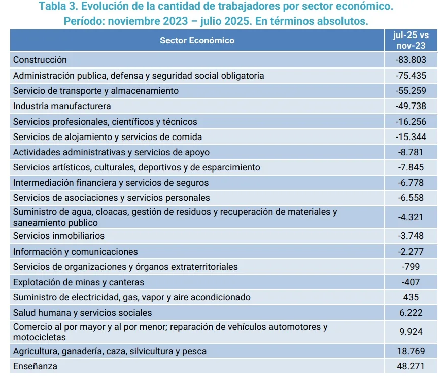 El sector más afectado en términos de pérdida de puestos de trabajo fue el de Construcción, con una reducción de 83.803 trabajadores entre noviembre de 2023 y julio de 2025. Le sigue el sector de Administración pública, defensa y seguridad social obligatoria, que perdió 75.435 puestos en el mismo período. También registraron caídas significativas los sectores de Servicios de transporte y almacenamiento, con 55.259 empleos menos, e Industria manufacturera, con una pérdida de 49.738 puestos de trabajo.