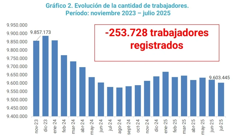 En el período analizado la cantidad de trabajadores/as registrados/as en unidades productivas se redujo un 2,57%, lo que representa una pérdida de 253.728 puestos de trabajo, al pasar de 9.857.173 en noviembre de 2023 a 9.603.445 en julio de 2025, representando más de 416 (416,63) trabajadores/as registrados/as menos por día desde la asunción del gobierno de Javier Milei.