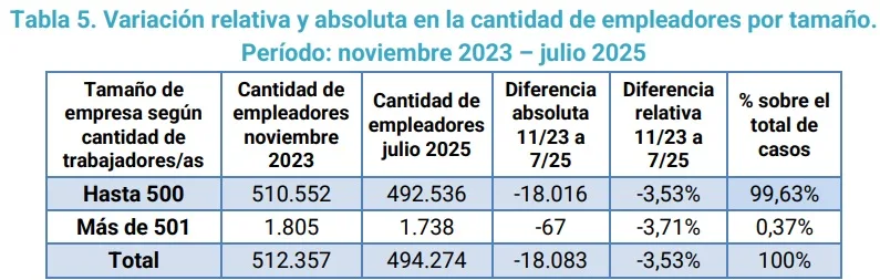 Según el estudio, la comparación entre noviembre de 2023 y julio de 2025 muestra una disminución en la cantidad de empleadores con trabajadores registrados a cargo, pasando de 512.357 a 494.274. Esto implica una contracción de 18.032 empresas, es decir, casi 30 (29,69) empresas por día, reflejando una tendencia negativa en el tejido empresarial durante el período.