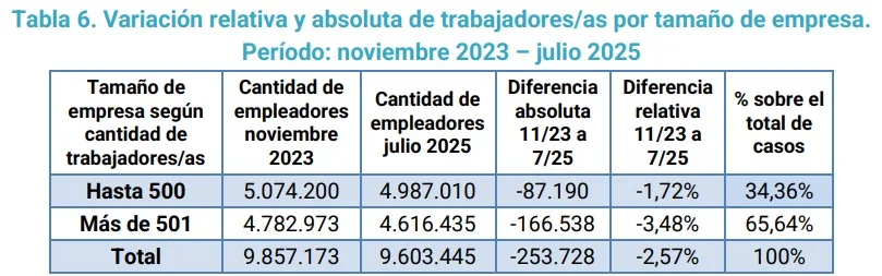 Al analizar la pérdida de empleo registrado según el tamaño de las empresas, se observa que la mayor expulsión de trabajadores se concentró en las firmas de gran porte: el 65,64% de la caída total del empleo registrado (equivalente a 166.538 puestos) se produjo en empresas con más de 500 trabajadores/as. En contraste, las empresas con menos de 500 empleados/as redujeron sus plantillas en 87.190 trabajadores, lo que representa el 34,36% del total de empleos perdidos entre noviembre de 2023 y julio de 2025