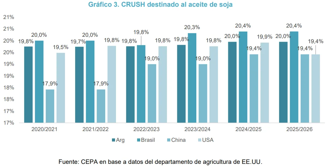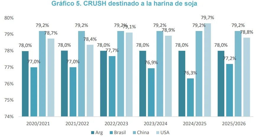 Sin embargo, a diferencia de otros grandes productores como Estados Unidos o China, en Argentina se observa una marcada orientación exportadora. En el caso local, tanto el aceite como la harina de soja se colocan en el mercado externo en etapas relativamente tempranas del proceso productivo, sin avanzar de manera significativa hacia instancias posteriores de transformación industrial. En consecuencia, el país consolida su rol como proveedor de insumos intermedios en la cadena global, resignando parte del potencial asociado a la industrialización avanzada y a la generación de empleo en sectores vinculados.
