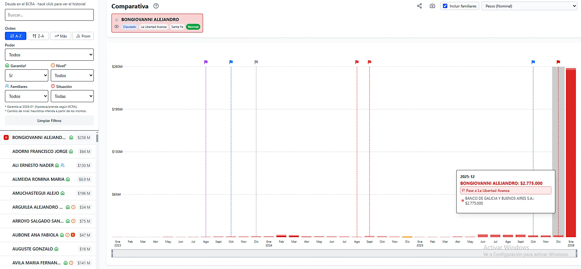 La herramienta presenta ordenadamente datos de la Central de Deudores del Banco Central de la República Argentina (BCRA), una base pública que registra el nivel de endeudamiento de todos los argentinos en el sistema financiero. Incluye la situación de 1440 funcionarios actualizada a enero último.