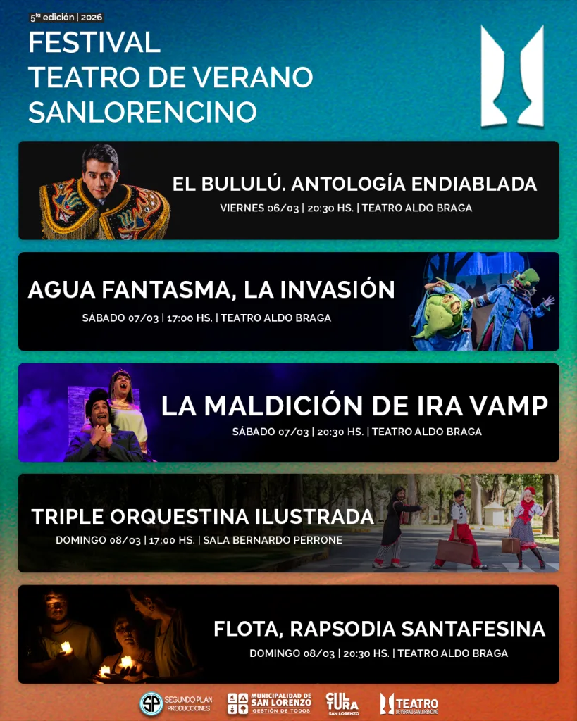 La 5ª edición del Festival Teatro de Verano Sanlorencino es un evento cultural organizado por la productora teatral independiente Segundo Plan que desde 2022 se sostiene de manera ininterrumpida en la ciudad y que hoy se consolida como uno de los encuentros teatrales más convocantes de la región.
