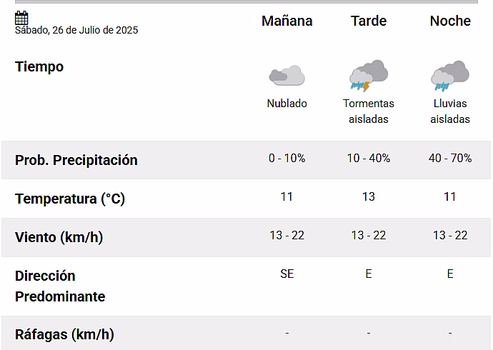 El pronóstico oficial anticipa un sábado con probabilidad de tormentas aisladas durante la tarde y posibles lluvias por la noche. Además, frío: la máxima prevista es de solo 13 grados. Los vientos soplarán del este y sureste.