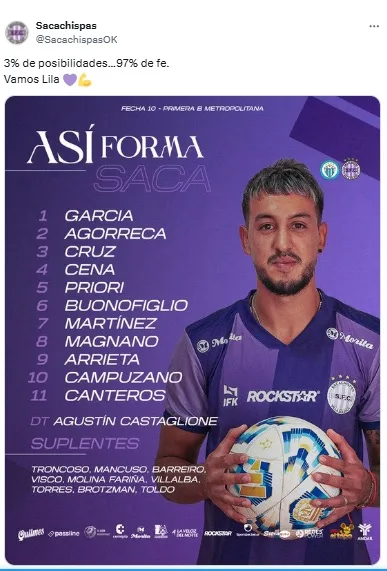 El domingo pasado, al anunciar su formación contra Argentino de Merlo, posteó: «3% de posibilidades… 97% de fe. Vamos Lila». La entidad del Bajo Flores continuó con sus guiños el viernes, cuando publicó otra broma: «Nos desapareció el 3… Estos son los 11 para hoy. Vamos Lila», eliminando el apellido de su lateral número tres en la imagen del equipo titular.