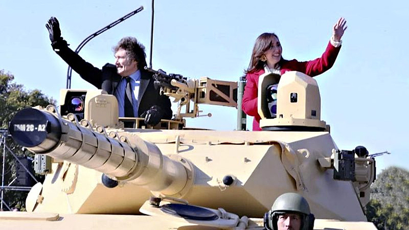 Aquel desfile es recordado también por haber registrado la última imagen de Milei y la vicepresidenta Victoria Villarruel posando juntos y sonrientes, mientras se encontraban subidos a un tanque militar.