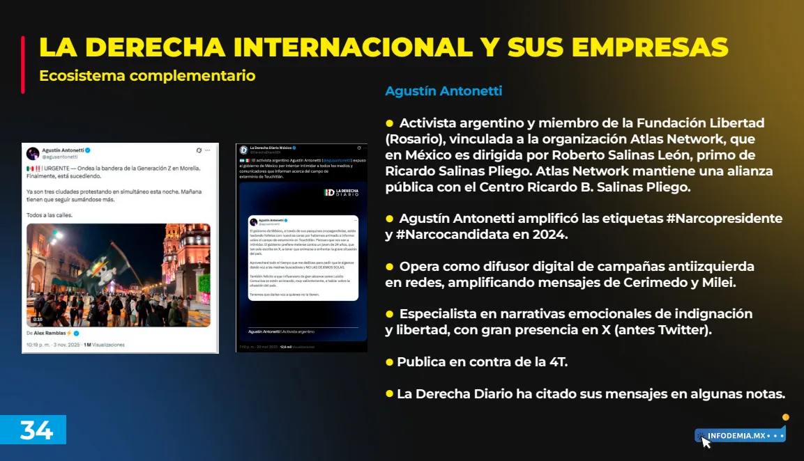 Infodemia depende del Sistema Público de Radiodifusión del Estado Mexicano. Además de a políticos y organizaciones mexicanas, incluyó entre los promotores cibernéticos de la movilización del 15 de noviembre pasado a Atlas Network, vinculada a Roberto Salinas León –primo del poderoso empresario Ricardo Salinas Pliego–, la Derecha Diario México –dirigido por Javier Negre y vinculada a Salinas Pliego–, a Cerimedo, a Eduardo Menoni, creador de contenido con discurso antiestatal y crítico de gobiernos progresistas. Y a Antonetti. La agencia agregó que son los mismos actores y redes que impulsaron campañas coordinadas en Brasil, Bolivia, Perú y Argentina, entre otros países.